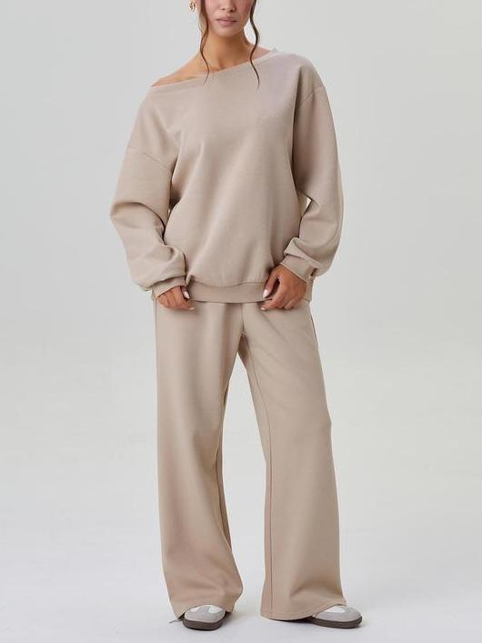 Women's Solid Sloping Shoulder Long Sleeve Top & Wide Leg Trousers Set